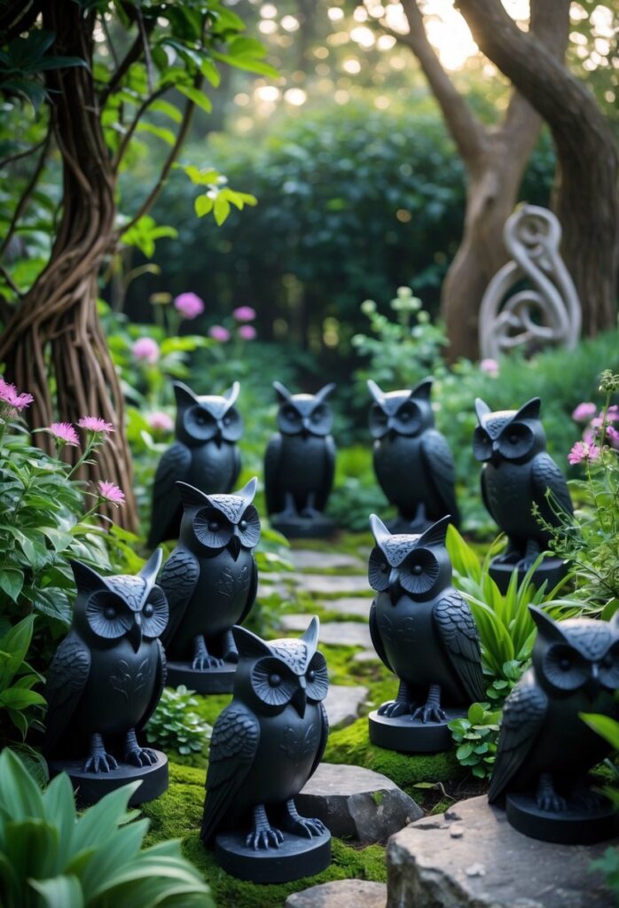 Black bat and owl statues add a mysterious touch to a witchy garden. These animals are often connected to night, magic, and protection.